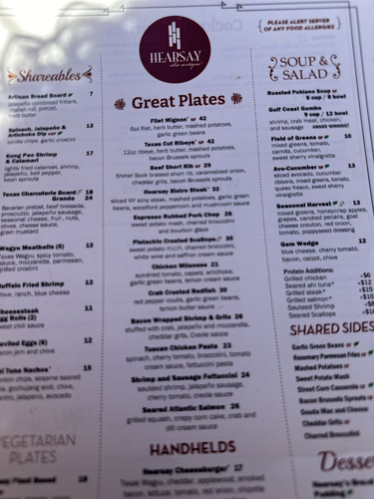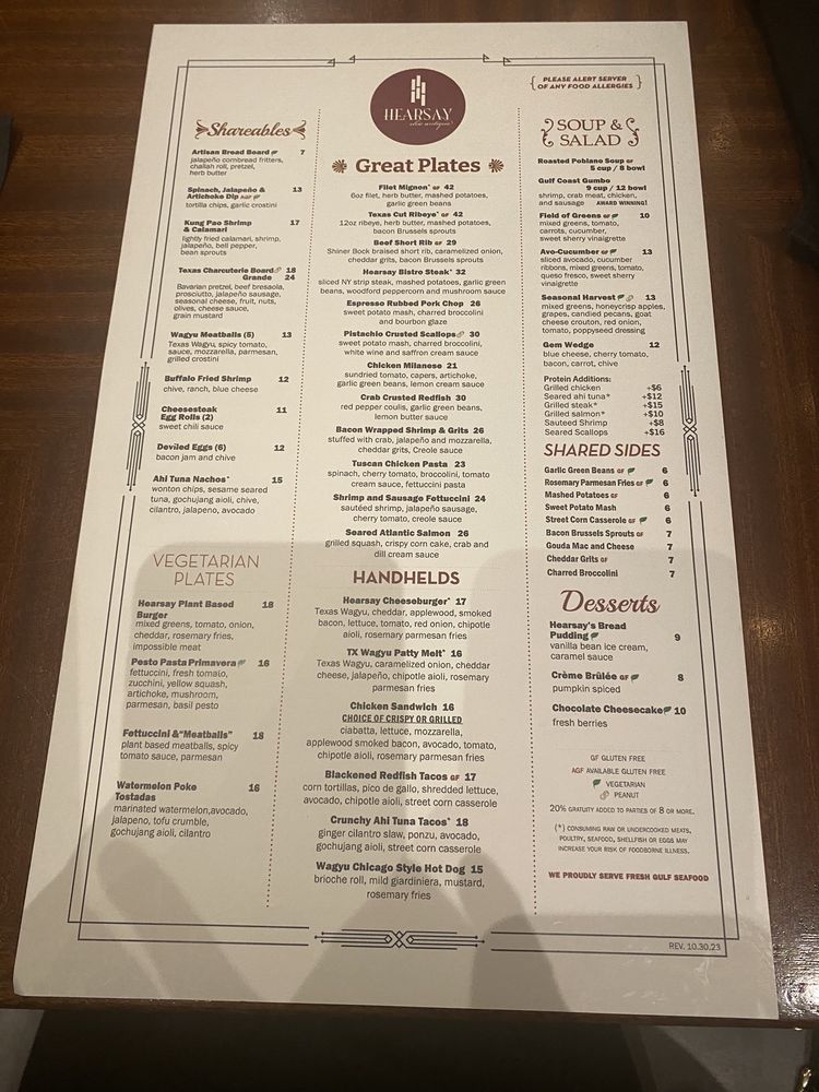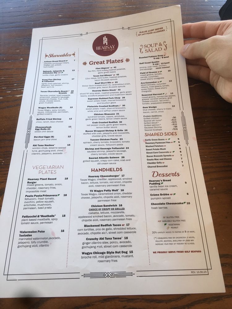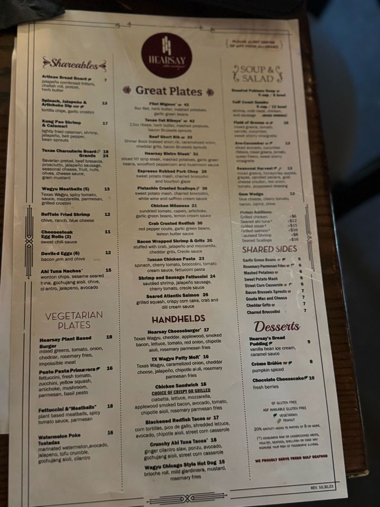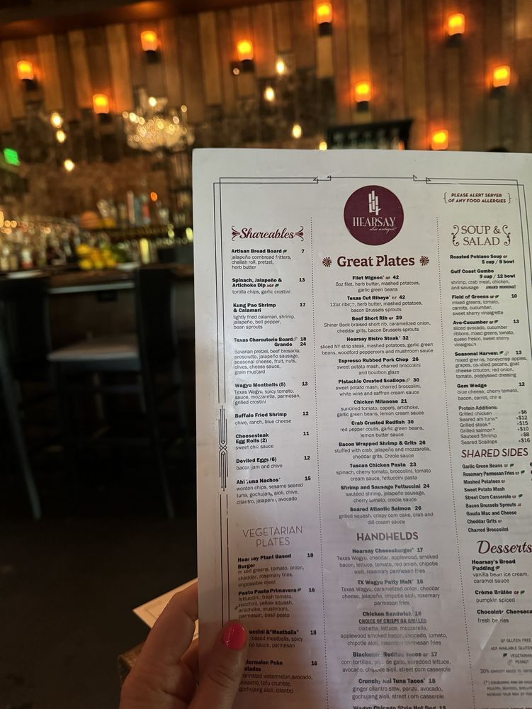 "Introducing the menu at Hearsay On The Waterway, a New American restaurant located in The Woodlands, TX, is an experience not to be missed. With a trendy and upscale ambiance, this restaurant offers a wide range of options for breakfast, brunch, and cocktails. The menu includes vegan options and features dishes like Waygu Meatballs and Gouda mac and cheese that are sure to tantalize your taste buds. The atmosphere with outdoor seating and a lively bar area adds to the overall dining experience. While some reviewers mention minor hiccups with certain dishes, the overall consensus is overwhelmingly positive. Whether it's a date night, a special occasion, or a work event, Hearsay On The Waterway is the perfect choice for a memorable dining experience."